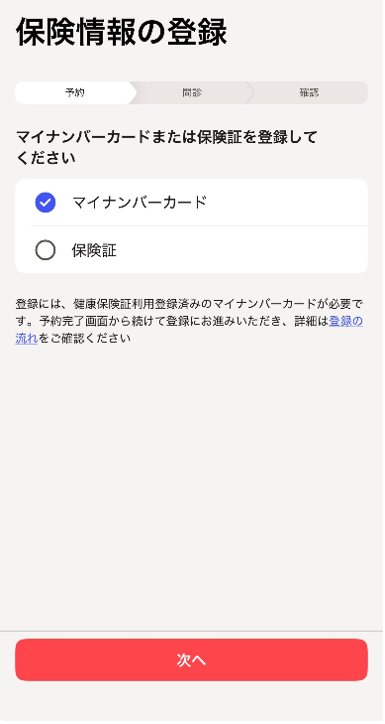 マイナンバーカードを選択した場合は、登録はご予約確定後になります。